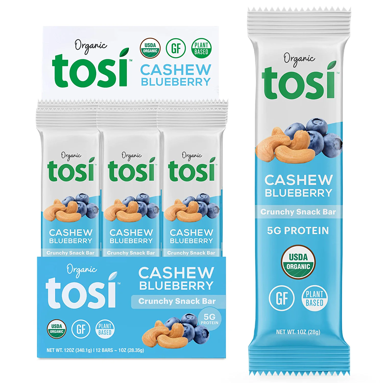 Tosi Nut Bars, 5G Protein (12 Pack, 1oz Bars), Plant Based Protein Bars, Crunchy Vegan Snacks, Blueberry Cashew Bars, Low Sugar Healthy Snacks, Gluten Free, Soy Free, Fiber, Flax & Chia Seeds